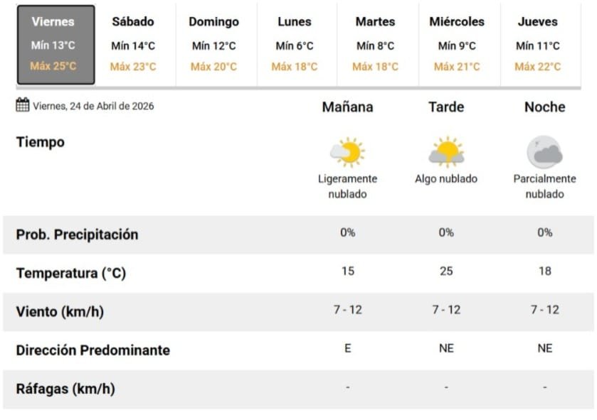 Para este viernes 24 de abril de 2026, el Servicio Meteorológico Nacional (SMN) indica que en la jornada de hoy habrá una mínima de 13° y una máxima de 25°. A su vez, el ente indica que el valor de la humedad en las primeras horas de la mañana es de 95%.
