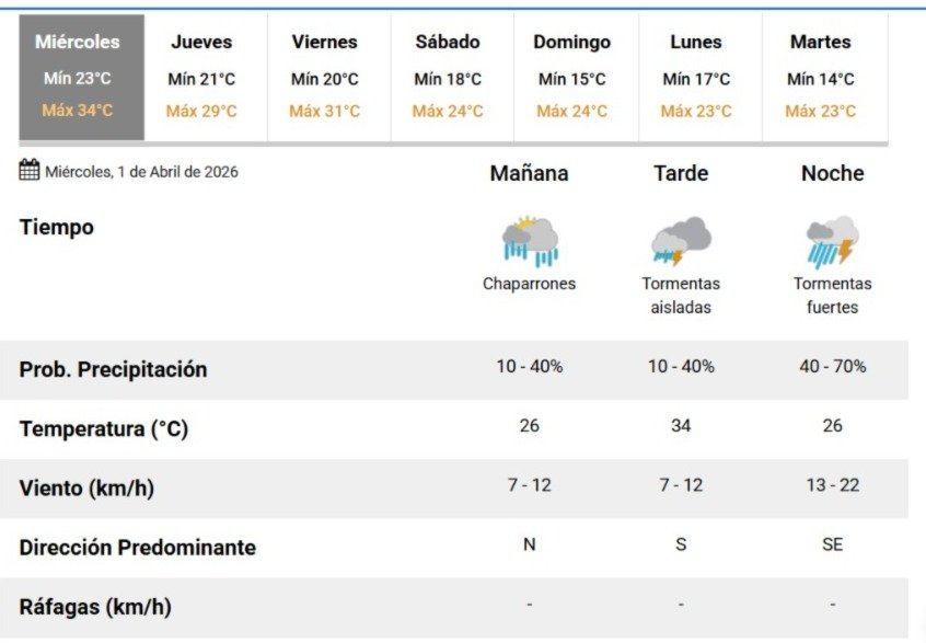 Con respecto a las precipitaciones, el SMN indica que hay entre 10% y 40% de probabilidades por la mañana y la tarde, mientras que a la noche hay entre 40% y 70% de chances de tormentas.