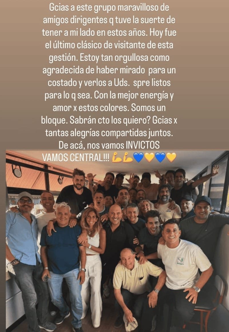 En una historia de Instagram, la dirigente expresó: “Gracias a este grupo maravilloso de amigos dirigentes que tuve la suerte de tener a mi lado en estos años. Hoy fue el último clásico de visitante de esta gestión. Estoy tan orgullosa como agradecida de haber mirado para un costado y verlos a ustedes. Siempre listos para lo que sea y con la mejor energía por amor de estos colores. Somos un bloque. ¿Sabrán cuánto los quiero? Gracias por tantas alegrías compartidas juntos. De acá nos vamos invictos”.