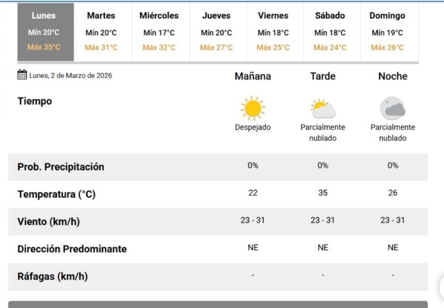 Para el día de hoy se anuncia una temperatura mínima de 20° mientras que el pico máximo del termómetro tocará los 35°.