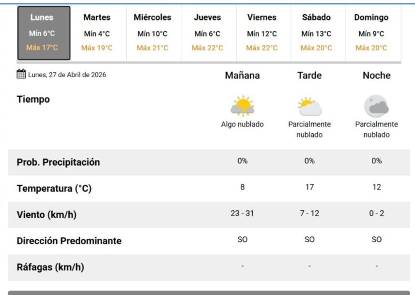 El cielo estará algo nublado durante toda la jornada, pero no se anuncia ningún tipo de probabilidad de lluvias. Mañana martes, será un día aún más frío, ya que la mínima pronosticada es de 4°, mientras que la máxima llegará a 19°.