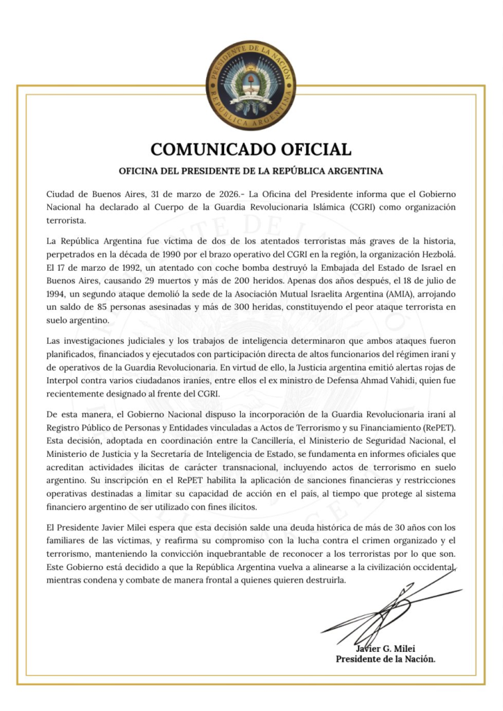 El trasfondo local también resulta clave: las investigaciones por los atentados de los años 90 continúan siendo un eje central en la política exterior argentina. En ese sentido, la inclusión de la Guardia Revolucionaria no solo tiene efectos operativos, sino también un fuerte valor simbólico al ratificar la postura del Estado sobre la responsabilidad iraní.