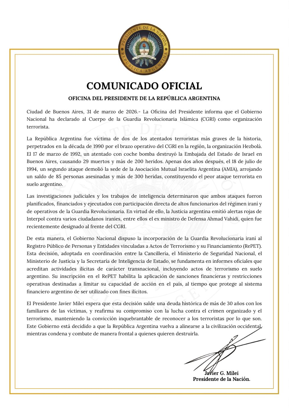 Sin embargo, el comunicado de Irán evita referirse a estos hechos. No menciona ni la AMIA ni la Embajada de Israel, manteniendo la postura histórica de negar cualquier vinculación con los atentados.