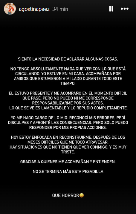 Frente a la masiva divulgación y crítica por la filmación de su padre, la abogada publicó en sus redes sociales que no tiene «absolutamente nada que ver con lo que está pasando», dejando en claro que no estaba en el mismo lugar que su padre cuando ocurrieron los hechos. «No puedo ni me corresponde responsabilizarme por sus actos«, detalló.