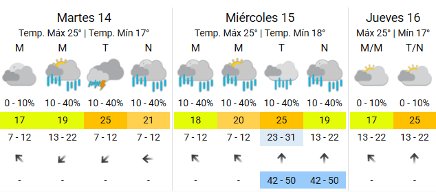 Ya entrando al miércoles, los chaparrones se mantendrían constantes durante toda la jornada. La máxima se mantendrá en 25º y la mínima subirá a 18º. Además, en la tarde-noche se presentarán ráfagas de entre 40 y 50 km/h.