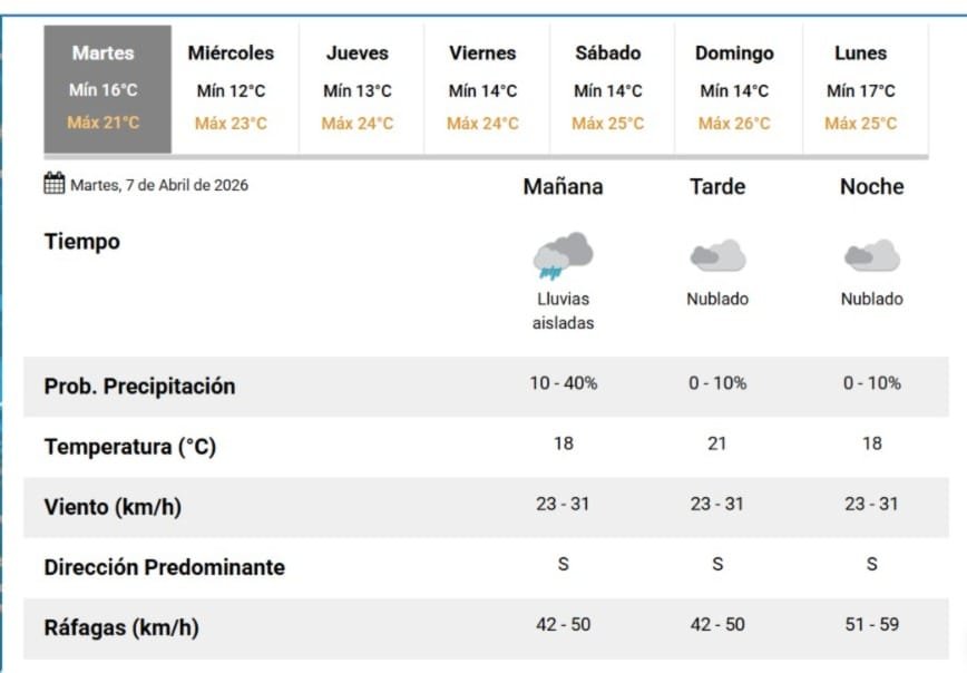Para este martes 7 de abril de 2026, el Servicio Meteorológico Nacional (SMN) anuncia una jornada con una temperatura mínima de 16° y una máxima de 21°. Para la mañana de este segundo día laboral de la semana, hay entre 10% y 40% de probabilidades de lluvias por la mañana.
