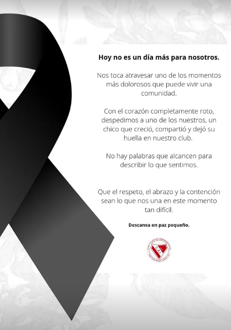 «Hoy no es un día más para nosotros«, es la frase que encabeza el comunicado del club. «Nos toca atravesar uno de los momentos más dolorosos que puede vivir una comunidad. Con el corazón completamente roto, despedimos a uno de los nuestros, un chico que creció, compartió y dejó su huella en nuestro club». Otros clubes se solidarizaron y mostraron su apoyo y compañía a la institución deportiva y a la familia de Ian en esta difícil situación.