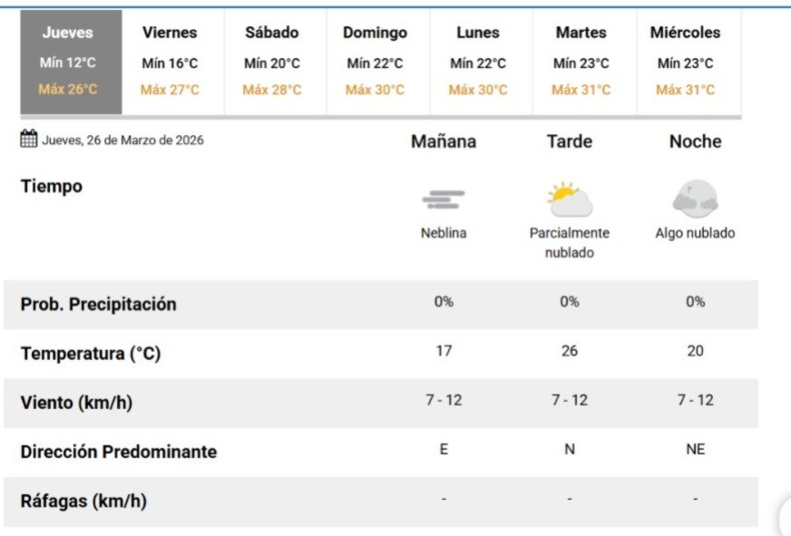 Para este jueves 26 de marzo de 2026, el Servicio Meteorológico Nacional (SMN) señala que la jornada inició bastante fría, registrando una temperatura mínima de 12°. En la mañana, el SMN advierte sobre un delgado blanco de niebla.