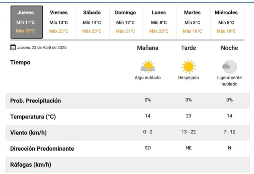 Todo parece indicar que ya no se registrarán días de calor en esta etapa del año. El Servicio Meteorológico Nacional (SMN) señala que para este jueves, la temperatura mínima será de 11° mientras que la máxima alcanzará los 23°.