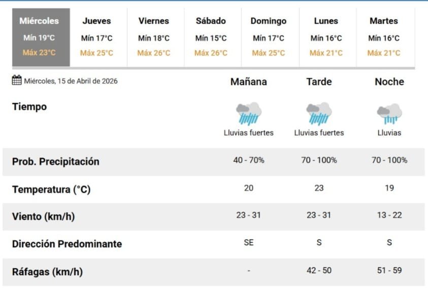 Para este miércoles 15 de abril, el Servicio Meteorológico Nacional (SMN) anuncia una jornada con una temperatura mínima de 19° y una máxima de 23°, y registrando también altos índices de humedad.
