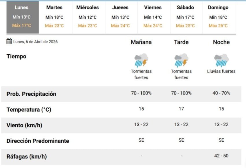 Para este lunes 6 de abril, el Servicio Meteorológico Nacional (SMN) anuncia una jornada que tendrá una temperatura mínima de 13° y una máxima de 17°, notándose así una considerable baja de la temperatura en relación a las últimas semanas.