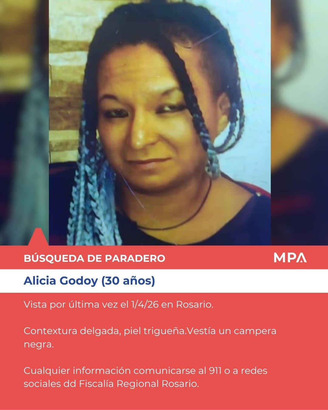 El Ministerio Público de la Acusación solicita ayuda para encontrar a Alicia Godoy, una mujer de 30 años de la que no hay noticias hace unas dos semanas. La última vez que la vieron fue en casa de un allegado, en Juan de la Cierva al 2300, en la zona suroeste rosarina.
