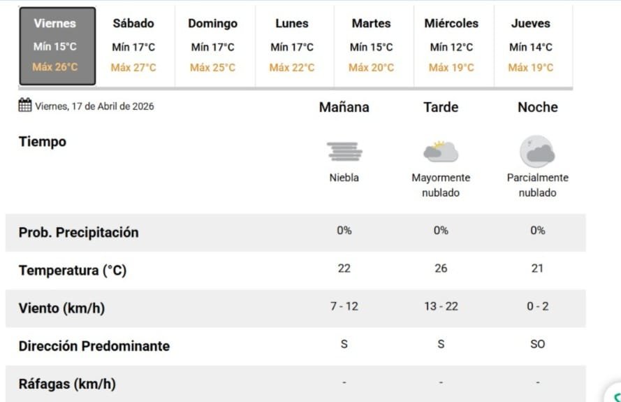 Para este viernes 17 de abril, el Servicio Meteorológico Nacional (SMN) anuncia una jornada con una mínima de 15° y una máxima de 26°. El cielo estará mayormente nublado y se reporta la presencia de niebla en bancos en las primeras horas de la mañana.